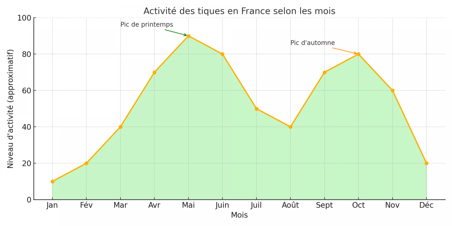En France, les tiques chez le chien sont surtout actives du printemps à l’automne, avec un pic au printemps (avril à juin) et un second en automne (septembre à novembre). Toutefois, certaines espèces peuvent rester actives même l’hiver lors de journées douces, ce qui prolonge le risque d’infestation pour les chiens, notamment dans les régions tempérées (INRAE – CiTIQUE).